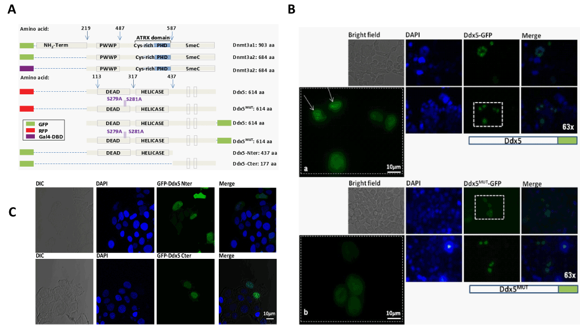 | Figure 3: Subnuclear localization of GFP-tagged Ddx5 and Ddx5MUT proteins. A.Schematic representation of GFP-tagged Dnmt3a1, Dnmt3a2, Ddx5-Nter, Ddx5-Cter, RFP-tagged Ddx5 and Ddx5MUT and Gal4(DBD)-Dnmt3a2 proteins. Numbers indicate amino acid positions. B. Fluorescence microscopy of EGFP-Ddx5 (Top) and Ddx5MUT (Bottom) proteins. White arrows indicate EGFP-Ddx5 nuclear speckles. C. Confocal microscopy of EGFP-Ddx5Nter and EGFP-Ddx5Cter proteins. |