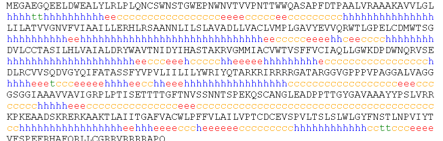 |  The Percentage of Alpha helix (Hh), Random coil (Cc), Extended strand (Ee), Beta turn (Tt) is 41.93, 40.58, 15.25, 2.24 respectively. 310helix (Gg), Pi helix (Ii), Beta