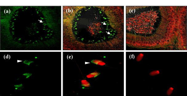 | Figure 9: Images showing the expression of REHbβP in the cauda epididymis (Mag X 40) (a-c) and spermatozoa (d-f) (Mag X 100) (a,d= FITC; b,e= PI, FITC merge and c,f= pre-immune controls). Stereocilia of epididymis and spermatozoa are positive for REHbβP. The protein localized on the acrosome of the sperm (PSCE= Pseudo-stratified columnar epithelium). The figures shown are the representative pictures from three independent experiments . |