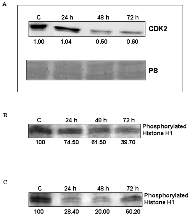 | Figure 3: Protein and activity profi les of CDK2 in WISH cells treated with IFNγ. WISH cells were either not treated (control) or treated with 200 U of IFNγ for 24 hrs, 48 hrs or 72 hrs and the whole cell lysates were: western blotted for CDK2 (A), or assayed for total CDK2 activity (B) or cyclin E-CDK2 activity (C). The densitometry values (indicated below respective lanes) for the treated samples in the representative blots/assays were normalised with respect to the control. Standard error for multiple independent experiments was ± 10%. PS: Ponceau S stained gel representing equal loading. |