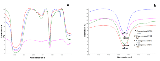 | Figure 3 : Secondary structure analysis by FTIR. Azurin from all P. aeruginosa strains were dissolved in 0.02 M PBS for analysis in Fourier Transform Infra-red (FTIR) spectroscopy. It showed azurin has C=O (protein backbone) stretching, a unique nature of the amide I band which is a characteristic feature of β-structure. FTIR spectrum also revealed there is a shift differences among azurin, synthesized by strains. Our FTIR analysis showed peak around 1646.936 in P. aeruginosa 2453 whereas, others showed peak around 1642.269, 1639.446, 1637.873 for P. aeruginosa 741, 1942, 1934 respectively. |
