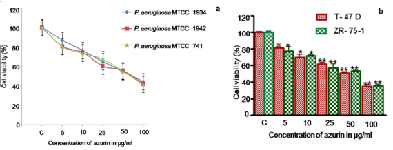| Figure 4 : MTT assay for azurin secreted by P. aeruginosa strains. (a) Azurin purified from P. aeruginosa 1934, 1942, 741strains were treated with ZR-75-1 breast cancer cell distinctly for cell viability and was measured by MTT assay. There was a significant growth inhibition of both ZR-75-1 at IC50 72± 3µg/ml. (b) Both T-47D and ZR-75-1 grown in 96-well plate were treated with various concentration of azurin from P. aeruginosa 2453 for 48 h. Bar (mean ± S.E) shows the cell viability (%) of ZR-75-1 and T-47D cell lines treated with increasing concentration of azurin from all strains. All results are expressed as percentage of control and are mean ± S.E and statistically analyzed by using t test .p values (*-0.05, **-0.01 were considered significant against control cells. |