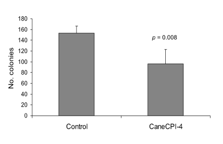 | Figure 8: Anchorage-independent colony growth in soft agar in the presence of sugarcane cystatin. B16F10-Nex2 cells (5x103) were cultivated in soft agar in 12-well plates as described previously in the presence of CaneCPI-4 at 1 µM. After 2-3 weeks, the colonies were stained and counted. p values in comparison to the control are shown. |
