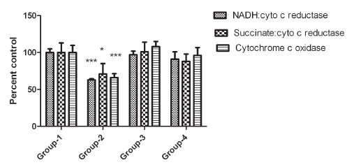 | Figure 6: Effect of co-administration of mitomycin C and cisplatin with or without the administration of B.aristata on respiratory chain enzymes.of kidney mitochondria. The animals were divided into four groups of six animals each. Group-1, received saline, group- 2, received a single dose of mitomycin C (2 mg/kg body weight, i.p.) and cisplatin (12 mg/kg body weight, i.p). Rats were sacrificed 48 h after the administration of drugs. Group 3, received alcoholic extract of B.aristata (10 mg/100 g body weight, oral) for three days. Group- 4 received alcoholic extract of B.aristata (10 mg/100 g body weight, oral) for three days, followed by single dose of mitomycin C (2 mg/kg body weight, i.p ) and cisplatin (12 mg/kg body weight, i.p). Rats were sacrificed 48 h after the administration of drugs. NADH: cytochrome c reductase: 20 µg of mitochondrial protein was used for each assay. Activity is expressed as n moles of cytochrome c reduced /min/ mg protein. Results are expressed relative to control which was taken as 100. The control value was 262+13. Succinate:cytochrome c reductase: 20µg of mitochondrial protein was used for each assay. Activity is expressed as n moles of cytochrome c reduced /min/ mg protein. Results are expressed relative to control which was taken as 100. The control value is 33+4.0. Cytochrome c oxidase: 1 µg of mitochondrial protein was used for each assay. Reduced cytochrome c was used for each assay. Activity was expressed as n moles of cytochrome c reduced / min/ mg protein. Results were expressed relative to control which was taken as 100. The control value is 884+86. Values are Mean ± SD for at least 13 animals. *p<0.05, **p<0.01, and ***p<0.001. |