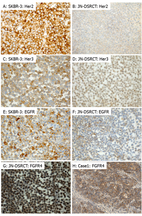 | Figure 1: Immunocytochemical analysiswas performed using cell blocks of JN-DSRCT and SKBR-3 cell lines. In this assay, SKBR-3, a breast cancer cell line, was used as a positive control for HER2, HER3, and EGFR expressions. HER2, HER3, and EGFR expressions were not observed in JN-DSRCT cell line (B, D, and F), though expressions of these proteins were seen in SKBR-3 cells (A, C, and E). This analysis confirmed FGFR4 overexpression in a JN-DSRCT cell line (G). FGFR4 was over expressed in one of the 2DSRCT clinical samples (H). |