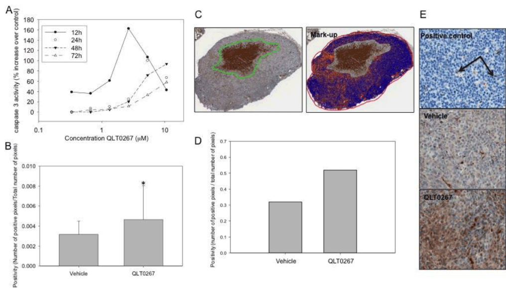 | Figure 6: Caspase-3 expression is increased in tumors treated with QLT0267. In vitro analysis of Caspase3/7 activity was performed using a luminescent based Caspase-3/7 assay (A). As shown, treatment using QLT0267 was able to promote increased Caspase activity in vitro with a peak at 12 hours after treatment. Vehicle and QLT0267 treated tumor cores were subject to Caspase-3 staining and quantification using Aperio Image Scope software. A significant increase in Caspase-3 expression was observed (P<0.05) (B). Whole tissue sections were analyzed for Caspase-3 expression using the Aperio Image Scope software. The whole tumor section was marked off as the region of interest except region outlined in green representing necrotic tissue plus a margin was excluded from the analysis (C). The colorized image represents the mark-up after the positive pixel count algorithm was performed:blue represents negative pixels, orange positive pixels, and red strongly positive pixels (C). Note that the region selected as necrotic was not included in the mark-up image. Quantification of all sections analyzed from the 6 hour time-point shows that QLT0267 treated tissues has significantly higher Caspase-3 activation than vehicle treated tumors (P<0.05) (D). Positive control tonsil tissue (E) exhibits single positive cells scattered throughout negative tissue (see arrows). Vehicle treated tumor tissues (E) exhibits diffuse weak cytoplasmic staining with some positive cells, while QLT0267 treated tumors show increased cytoplasmic staining and an increase in the number of positive cells (E). |