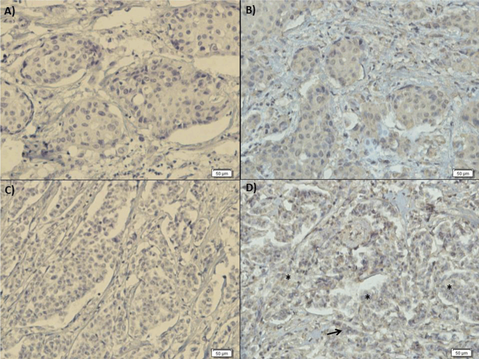 Figure 3: Immunohistochemical assay with the polyclonal antibody anti-ADAM33. Ductal samples were composed of cells with marked atypia, hyperchromatic nuclei and coarse chromatin, ample cytoplasm and indistinct boundaries. A) IDC negative control, B) IDC anti–ADAM33: cytoplasmic and weak membrane signal positivity for antibody evidenced by the brown color of these structures. For lobular samples we observed atypical neoplastic cells arranged in solid aggregates or in a single row, and a little desmoplastic matrix, interspersed in the neoplastic lobules. C) ILC negative control, D) ILC anti–ADAM33: poor response to polyclonal anti-ADAM33 antibody showing the region with invasive lobular cancer cells in a single row (arrow), * Invasive lobular cancer cells in aggregates, 200 X.