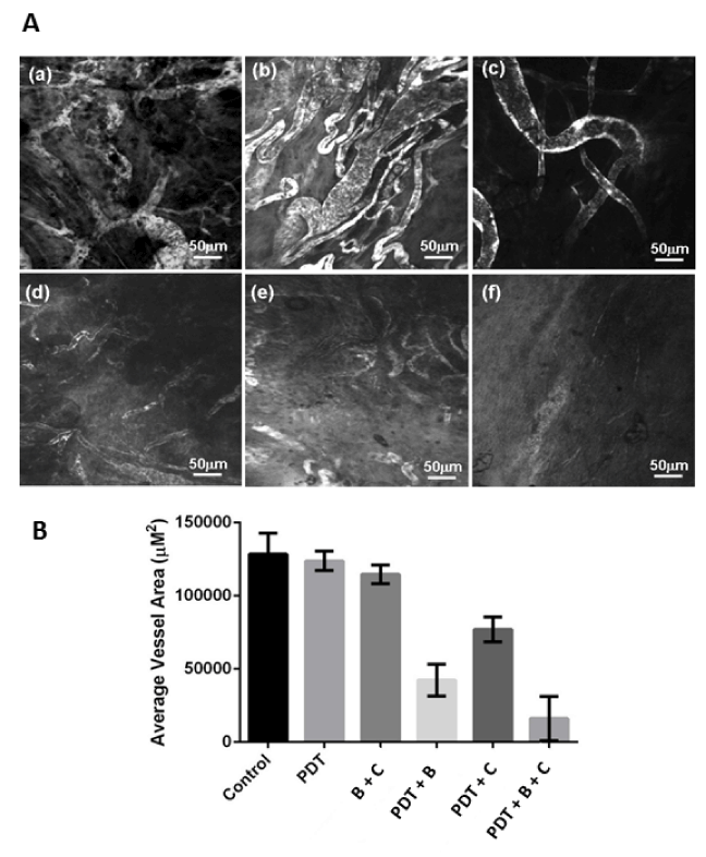 | Figure 5: (A): Tumor blood vessels visualized approximately 30 min after intravenous administration of FITC-dextran in (a) control, (b) PDT only, (c) Bevacizumab + cetuximab, (d) PDT + bevacizumab, (e) PDT + cetuximab and (f) PDT + bevacizumab + cetuximab treated models using confocal endomicroscopy. Magnification X200, scale bar = 50 μm. (B) Average vessel area for each animal group was calculated from images captured from three locations with high vessel density and that are 20 and 40 μm below the surface of the tumor. |