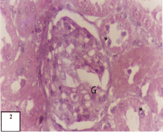 | Figure 2: Light Micrographs of rat kidney treated with Etoposide for 8 weeks. Note the onset of necrosis and atrophied glomerulus (G). Large vacuoles (*) in the epithelium of tubules. Acute loss of brush border of the tubular lumen (thin arrow). Magnification taken (x 40). |