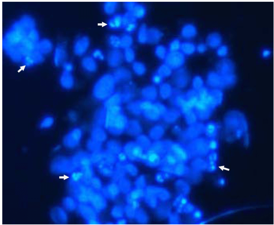 | Figure 20: PC3 cells treated with 5nM leptomycin captured through fluorescent imaging. Apoptotic cells [bright spots] have been indicated with white arrows. In this case, the PC3 cells were treated with 5nM LMB and were incubated for 24 hours before being stained. The treatment with 5nM LMB obtained 36.67% of apoptotic cells. |
