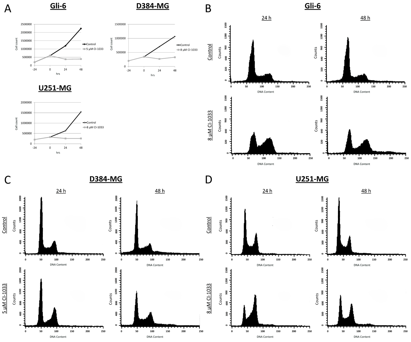 | Figure 3: Cell cycle profiles of Gli-6, D384MG and U-251 MG HGG cells treated with either control (DMSO) or 5 µM, 8 µM and 8 µM CI-1033 respectively. (A) Growth inhibition with CI-1033 treatment in proliferation assay. (B-D) Cell cycle distribution of cells after 24 or 48 hrs treatment with control (DMSO) or CI-1033. |