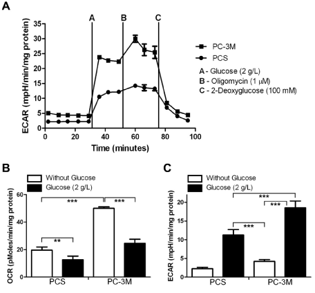 | Figure 1: The glycolytic activity and maximum glycolytic capacity was determined for PC3M and PCS cells in real-time using the Seahorse extracellular flux analyzer A) A series of extracellular acidification rates (ECAR) were calculated for cells glucose starved for two hours and subsequently treated with 2 g/L D-glucose (a), 1 1 μM oligomycin (b), and 100 mM 2-Deoxyglucose (2-DG) (c). ECAR following the addition of glucose defines glycolysis and ECAR following oligomycin represents maximum glycolytic capacity. ECAR prior to the addition of glucose and following treatment with 2-DG represents acidification associated with non-glycolytic activity. The data represent the mean ± standard deviation. B-C) Basal oxygen consumption rates (OCR) and extracellular acidification rates (ECAR) were determined for PC3M and PCS cells either in the presence or absence of 2 g/L D-gluocose. The data represent the mean ± standard deviation. A two-tailed student t-test was used to calculate statistical significance: ** p < 0.001 and *** p < 0.0001. |