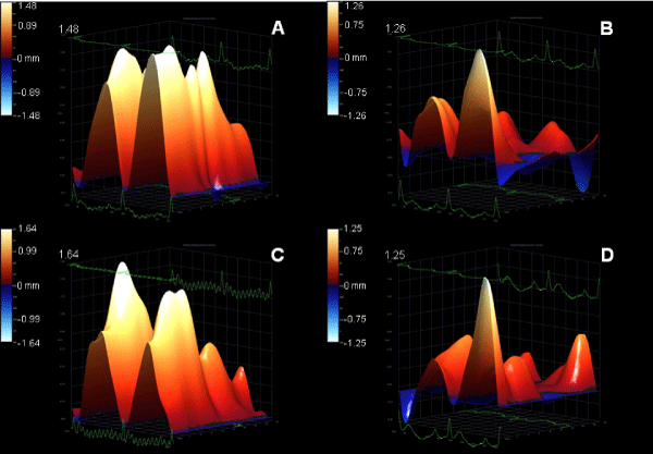 | Figure 3: Illustrative 3D parametric displays of global left ventricle radial displacement with the Vevo strain software in one Wistar rat of each experimental group: control (A), doxorubicin (B), doxorubicin + stem cell (C), doxorubicin + Camellia sinensis (D) The upper value of each graph was highlighted to better visualization. |