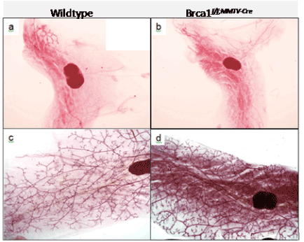 | Figure 1: Brca1 mutant mice exhibit an abnormally persistent dense mammary fat pad into adulthood. Representative mammary gland whole mounts of wildtype (a) and Brca1f/f;MMTV-Cre (b) mice at 3 weeks of age and at 6 months of age (c,d), respectively. Magnification, x 1. |