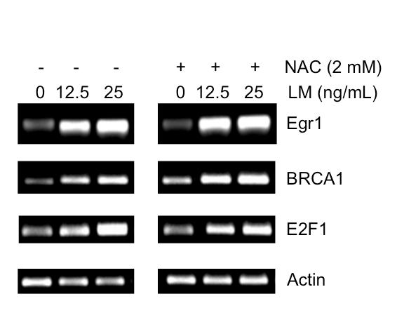 | Figure 6: Effect of NAC pretreatment on leinamycin-inducible genes in MDA-MB231 cells. The cells were pretreated with 2 mM NAC for 24 h before exposure to leinamycin (0, 12.5, and 25 ng/mL) for 24 h. Semi quantitative RTPCR was used to measure mRNA levels of EGR1, BRCA1, and E2F1 using actin as an internal control. |