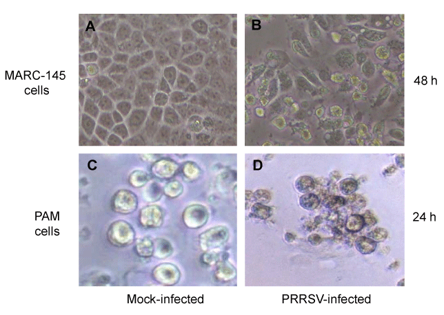 | Figure 1: Cytopathic effects of PRRSV on MARC-145 cells (A, B) and porcine alveolar macrophage (PAM) cells (C, D). Cells were infected with a multiplicity of infection of 5 and incubated for 24 h for PAMs or 48 h for MARC-145 cells for microscopy. CPE develops faster in macrophages than in MARC-145 cells. |