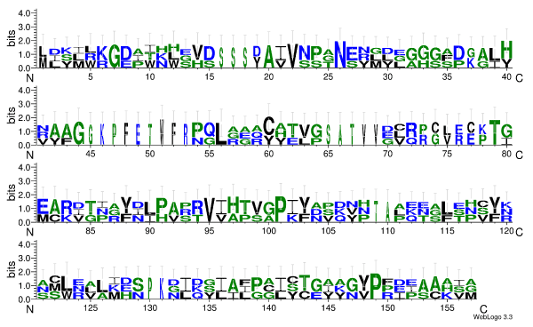 | Figure 2: The site-by-site variation analysis of A1pp domains among AT1G69340, AT2G40600 and YMX7_YEAST. We extracted the conserved domain of AT1G69340, AT2G40600 and YMX7_YEAST by SMART. We took the alignment of the three proteins, and then gained the site-by-site statistic of the conserved domain using weblogo 3.3 (http://weblogo.threeplusone.com/). Error bars indicated an approximate 95% Bayesian confidence interval. The information content of a site (bits) is defined as the relative entropy of the monomers at the site to the background distribution. |