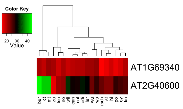 | Figure 6: The expression pattern of AT1G69340, AT2G40600 in 19 ecotypes during seedling stage. All the data were from the web site (http://mus.well.ox.ac.uk/19genomes) (all data was normalized by RPKM (Reads Per Kilobase per Million mapped reads)). “The color scale corresponds to the mean expression of a gene. Red represents low expression, while green represents high expression.” |