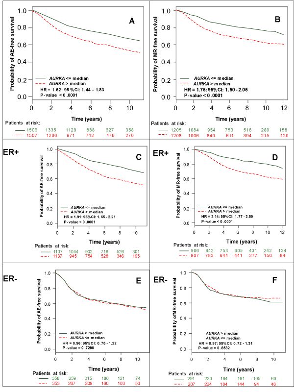 | Figure 1: Evaluating the prognostic impact of AURKA mRNA expression on any event (AE) and metastatic relapse (MR)-free survival. Kaplan-Meier’s survival curves for breast cancer patients according to tumor expression of AURKA are presented. The p values shown were obtained from a long-rank test among two groups. (A) Association of AURKA expression with AE-free survival. (B) Association of AURKA expression with MR-free survival. (C-F) Effect of AURKA expression levels on AE- and MR-free survival according to ER status. Kaplan- Meier estimates of AE- and MR- free survival according to the AURKA expression levels are shown. The p values were obtained from a long- rank test among two groups. |