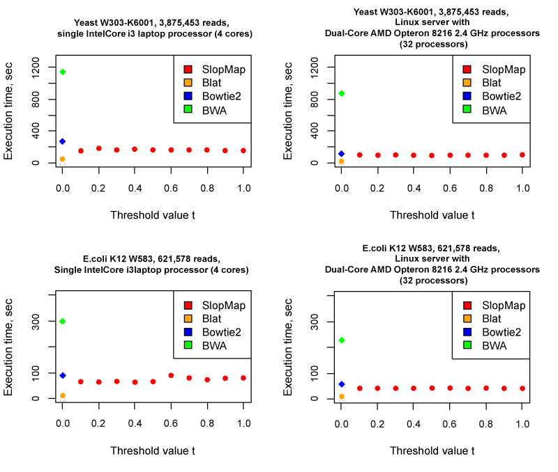 | Figure 8: Search duration. Comparison of execution time between search tools. SlopMap is consistently fast across a range of threshold values (t), and perform somewhat faster than Bowtie 2, and significantly faster than BWA while using the same amount of CPU resources. |
