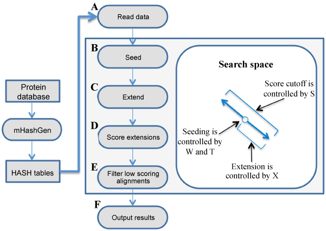 | Figure 1: The processing steps in the mBLASTX workflow. The database is first indexed using the mHashGen module and these index files are used in the alignment process. The query files are reads (A) and matching seeds between the queries and subjects are identified (B). These matches are then extended to high scoring segment pairs (C). These extensions are evaluated (D) and only significant alignments are kept (E) and displayed in the output (F). |