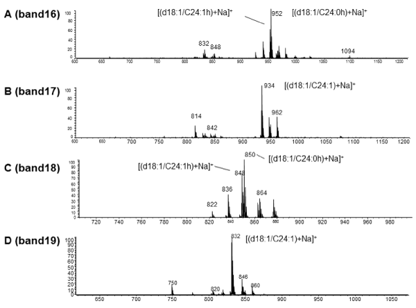 | Figure 5: TLC-Blot-MALDI-QIT-TOF MS spectra of bands 16, 17, 18, and 19. A, band 16 (sulfatide with hydroxyl fatty acid containing ceramide); B, band 17 (sulfatide with normal fatty acid containing ceramide); C, band 18 (galactosylceramide with hydroxyl fatty acid containing ceramide); D, band 19 (galactosylceramide with normal fatty acid containing ceramide). |