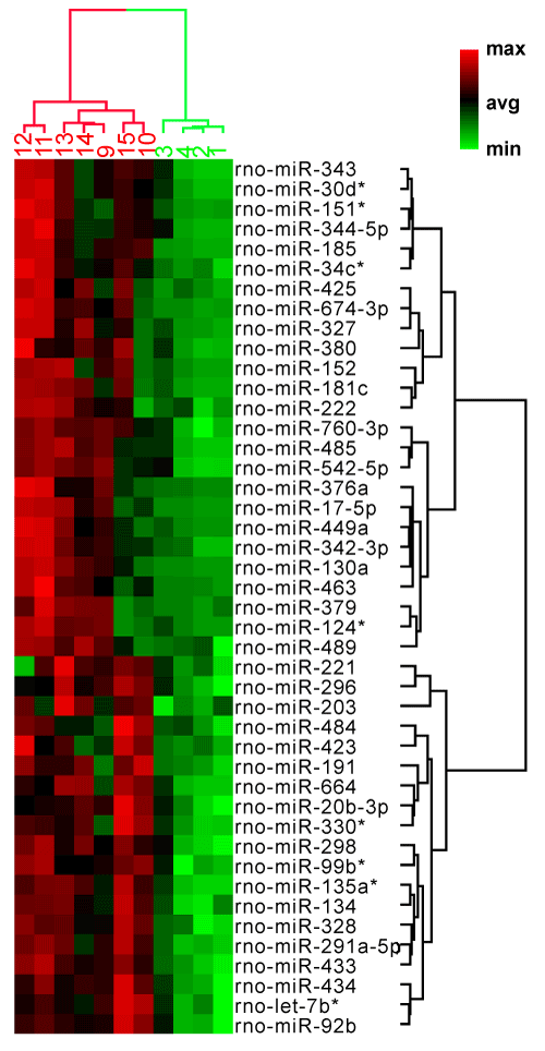 | Figure 2: Hierarchical clustering analysis of 44 differentially affected urinary miRNAs. The Welch’s t-test (p < 0.01) was used to identify the significantly changed (ΔCt value) urinary miRNAs at 24h after APAP dosing. The figure shows the clustering analysis of the 44 miRNAs that showed a >1.5-fold change between control (green animal numbers) and 1250 mg/kg APAP high dose group (red animal numbers). Relative miRNA concentration was reported as 2-ΔCt and the progressively brighter shades of red indicate higher miRNA levels; whereas, the green indicates lower levels. The identities of miRNAs are listed on the right and the animal numbers are on the top in color. |
