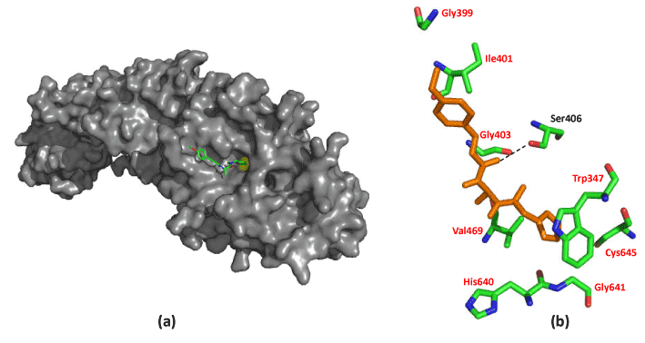 | Figure 5: Binding conformation of compound 5 inside the PAD4 binding pocket. Compound 5 is seen occupying the binding pocket with the furan ring is located in proximity with Cys645 (yellow) (a). PAD4 residues with hydrophobic contacts with compound 5 (orange, stick structure) are labeled in red, while hydrogen bond is drawn as dashed line (b). |
