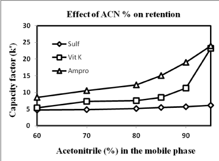 | Figure 4:Effect of ACN % on the retention of sulfaquinoxaline sodium (Sulf) (20 µg/ml), vitamin K3 (Vit K) (10 µg/ml), and amprolium hydrochloride (Ampro) (20 µg/ml). Mobile phase consisting of ACN and 0.2M NH4AC solution adjusted to pH of 5.7; flow rate=0.5 ml/min; ?=263 nm; the ACN% is as shown in the figure. |