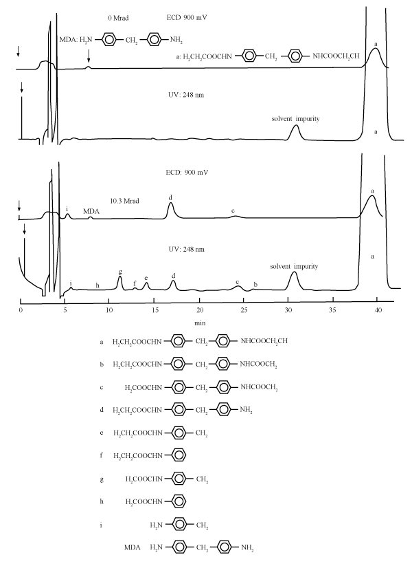 | Figure 3: HPLC chromatogram of irradiated and nonirradiated diethyl 4,4’ – methylenebis (N -phenylcarbamate). Detection was carried out by UV (248 nm) and ECD (900 mY). The structure of peaks (a)-{i} are determined as indicated in the footnote; (a) is a starting compound. They are produced predominantly by the cleavage at C-C linkage. |