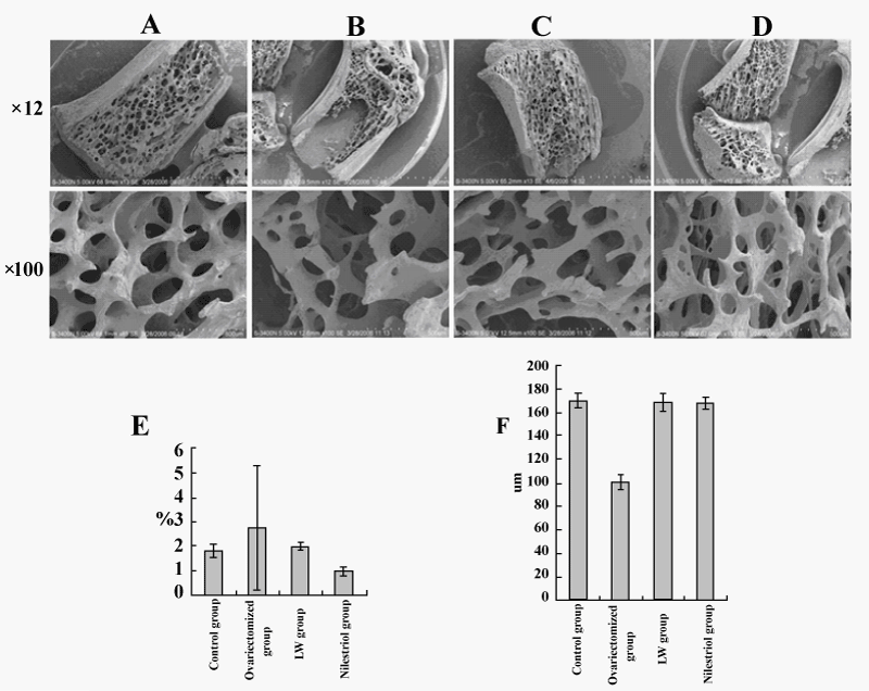 | Figure 3: LW can prevent and rescue osteoporosis in ovariectomized rats. Histomorphometric analysis of trabecular collected from control group (A); ovariectomized group (B); LW group (C); Nilestriol group (D). The bar chart illustrates the medullary cavity parameters derived from bone biomechanical testing (E). The bar chart illustrates the trabecular thickness parameters derived from bone biomechanical testing (F). |