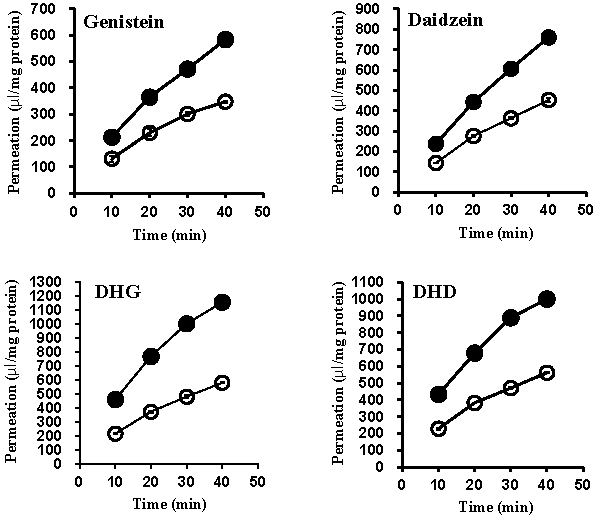 | Figure 2: Transport characteristics of genistein, DHG, daidzein, and DHDacross Caco-2 cell monolayers in the presence (●) and absence (○) of a proton gradient. Permeations of 50 μM genistein, DHG, daidzein, and DHD from the apical side to the basolateral side were measured at 37°C in the presence (●) and absence (○) of a proton gradient (apical pH, 6.0 or 7.4; basolateral pH, 7.4). Each point represents the mean ± S.D of three experiments.DHG, dihydrogenistein; DHD, dihydrodaidzein. |