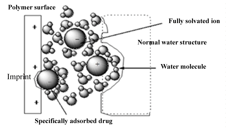 | Figure 4: A model of the solid/liquid interface with specific adsorption on the imprinted layer and non-specific adsorption of the substrate, showing the specific structure of adsorbed drug depends on the balance between adsorption and adsorption energy of the imprint The structure of intact water layer near polymer surface is formed (dash line) which is influenced by the polar anchoring of the monolayer to the interface between polymer surface and adsorbed species in case of specific adsorption on the polymer surface and non-specific adsorption, respectively [112]. |