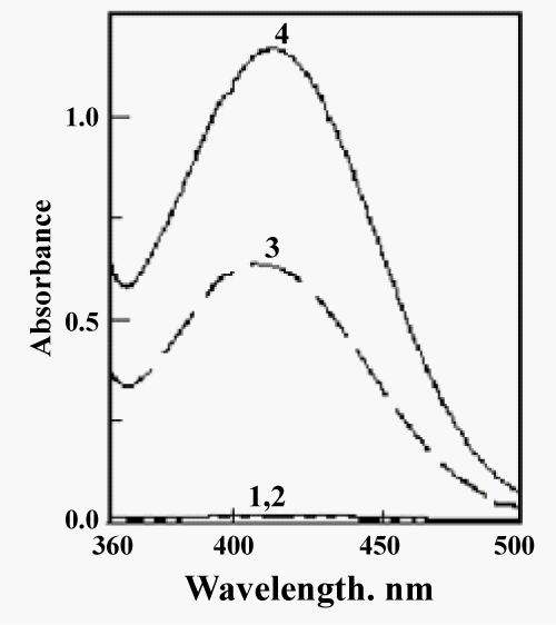 | Figure 1: Absorption spectra of FEX - dye complexes extracted into 10 mL chloroform: (3) 0.25 mL of 10-3 M FEX + 4 mL of 10-3 M BPB + 4 mL of pH 3.0 buffer, (4) 0.52 mL of 10-3 M FEX + 4 mL of 10-3 M BCP + 3 mL of pH 3.0 buffer, against their respective blanks (1,2) vs. distilled water. |