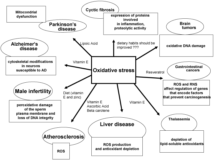 | Figure 1: The pro-oxidant/antioxidant balance is shifted in favour of the pro-oxidants in oxidative stres. Here is a diagram showing some of the disease processes driven by oxidative stres, related mechanisms involved and the role of antioxidants discussed. ROS: Reactive oxygen species. RNS: Reactive nitrogen species. AD: Alzheimer’s Disease. |