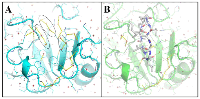 | Figure 5: Networks of hydrogen bond in the binding site. A- Networks of hydrogen bonds found in the binding site. Those in the circle were retired from the CsA bound. B- In the bound form, CsA is positioned in the place where networks occur in the apo form. |