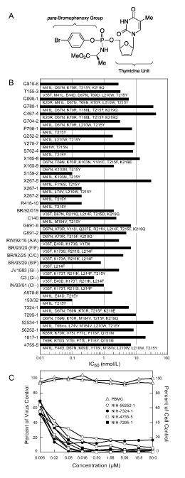 | Figure 1: [A] Chemical Structure of Stampidine. [B] IC50 values of Stampidine against 30 ARV-resistant primary clinical HIV isolates and 6 multi-drug resistant recombinant HIV clones. Preliminary findings were reported in part in references 32 and 33. [C] Potent ARV activity of Stampidine against multi-drug resistant HIV clones at non-cytotoxic concentrations. The cytotoxicity of Stampidine against PBMC was determined as detailed in Materials and Methods. Pooled results from two independent experiments that employed two separate GMP batches of Stampidine are presented. Stampidine inhibited HIV replication at nanomolar concentrations but it was not cytotoxic to PBMC even at a 50 micromolar concentration. |