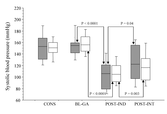 | Figure 2: Course of systolic blood pressure for hypertensive patients with and without diastolic dysfunction during the phase of induction of anesthesia Grey boxes = hypertensive patients with diastolic dysfunction; white boxes = hypertensive patients without diastolic dysfunction; CONS = day of anesthetic consultation; BL-GA = baseline before general anesthesia; POST-IND = just before tracheal intubation; POST-INT = just after tracheal intubation. Data are presented as median, 10th, 25th, 75th, and 90th percentiles. Arrows displayed significant difference within group between different events. The same figure was obtained with brachial pulse pressure. |