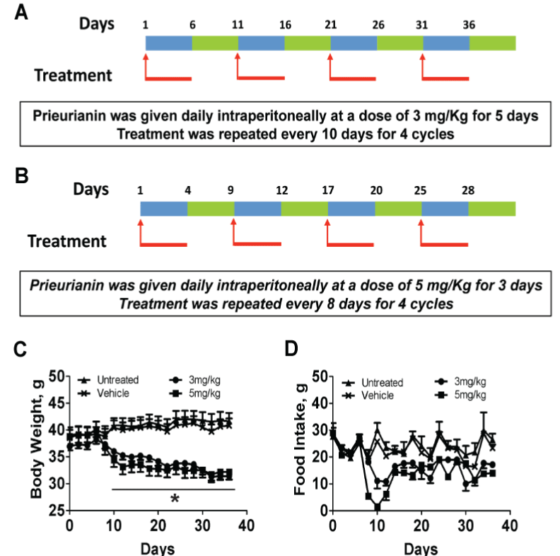 | Figure 2: Effects of drug holiday schedule for prieurianin in DIO mice. A, B, Drug holiday treatment protocols for prieurianin in DIO mice. This on-off or cyclical treatment strategy comprised of specifi ed doses of prieurianin at either 3 or 5 mg kg-1 were given as indicated for a defi ned duration coupled with intermittent drug holiday to overcome drug-induced tolerance. C, D, Drug holiday treatment schedule with either 3 or 5 mg kg-1 prieurianin circumvented drug-induced tolerance and produced a sustained weight loss (C) and reduced food intake (D). All studies consisted of 10 animals per group, except for the 3 and 5 mg kg-1 prieurianin treated groups (n=20). |