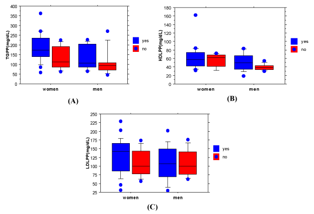 |  A: Effect of overweight and obesity on TGPP among women and men; B: Effect of overweight and obesity on HDL-c among men and women; C: Effect of overweight and obesity on LDL-c among men and women. |