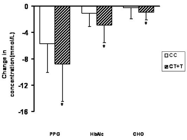 | Figure 1: The comparison of differential values (post-administration minus pre-administration) of PPG, HbAlc, and CHO between CC genotype and CT+TT genotypes of PTPRĪ“ rs17584499 polymorphism in T2DM patients after 12 weeks metformin treatment. *P < 0.05./td> |