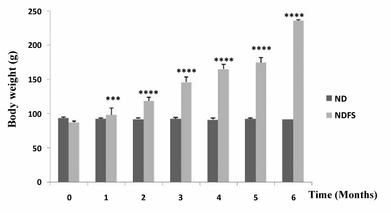|  ***p <0.001, **** p <0.0001 vs Natural diet ND: Natural diet, NDFS: Natural diet + fat and sucrose |