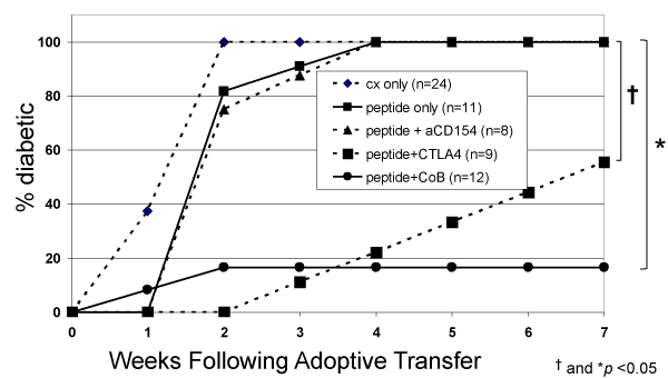 prevented by co-culture with CTLA4Ig and anti-CD154. Lymphocytes were harvested from BDC2.5.NOD mice and cultured for 4 days in the absence or presence of stimulatory peptide with or without CTLA4Ig and/or anti-CD154. 2.5 x 106 cells were then transferred intravenously to nod.scid recipients that were followed for diabetes. Cx only = cells cultured alone without peptide, CTLA4Ig or anti-CD154. CoB = the combination of costimulation blockade agents, CTLA4Ig and anti-CD154. p < 0.001 when comparing diabetes rates at 7 weeks in peptide only, peptide+CTAL4Ig, and peptide=CoB groups using exact contingency table analysis. In post-hoc Fisher exact test analysis, p < 0.001 (*) and p = 0.026 (†) comparing diabetes rates in peptide only group to peptide+cCoB or peptide+CTAL4Ig groups respectively. |