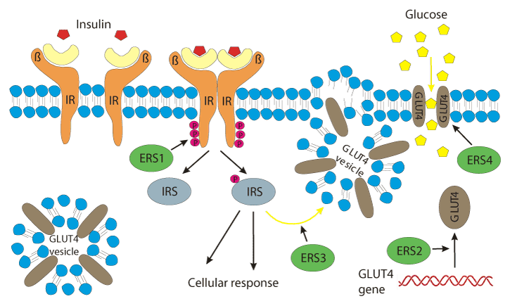 | Figure 2: Insulin receptor (IR) activation and glucose uptake. Insulin binding to α subunits induces the phosphorylation (P) of transmembrane β subunits generating insulin receptor signal transduction (IRS). Glucose transporter (GLUT4) vesicle translocation to the cell membrane allows intramembranous incorporation of GLUT4 and it enables the facilitated diffusion of glucose into the cell. Estrogen receptor signal (ERS) regulates the phosphorylation of IR protein (ERS1), participates in GLUT4 expression (ERS2) and translocation (ERS3), as well as in the intramembranous incorporation of GLUT4 (ERS4). |