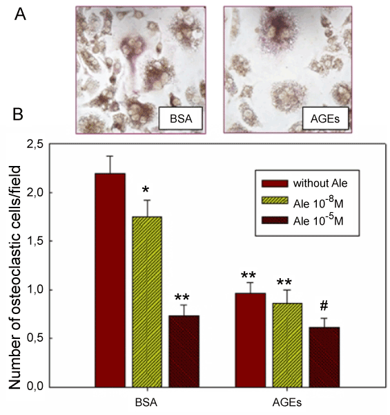 | Figure 3: Effect of AGEs and/or alendronate on osteoclastic recruitment. (A) The photographs show representative fields of TRAP-stained macrophage/ osteoblast co-cultures, incubated either with BSA (left) or with AGEs (right). Exposure to AGEs clearly decreases the abundance of multi-nucleated TRAP (+) osteoclasts. (B) Average number of osteoclasts per field in different culture conditions. UMR-106 osteoblastic cells and Raw 264.7 macrophages were co-cultured on coverslips placed in 6-well plates for 4 days until formation of multinucleated cells. They were then incubated for an additional 4 days with 100 μg/ml of BSA or AGEs, and/or different doses of alendronate (10-8M or 10-5M). Cell monolayers were then fixed, stained with Giemsa, mounted on slides and cells with 3 or more nuclei in 50 fields at 400x were counted and averaged per field. Results are shown as the mean ± S.E.M. (* p<0.05, ** p<0.001 versus BSA alone) (# p<0.01 versus AGEs alone) |