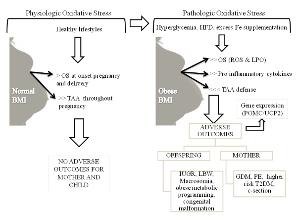 |  Abbreviations: BMI: Body Mass Index; OS: Oxidative Stress; TAA: Total Antioxidant Activity; HFD: High Fatty Diet; Fe: Iron; ROS: Reactive Oxygen Species; LPO: Lipid Peroxidation; IUGR: IntraUterine Growth Restriction; GDM: Gestational Diabetes Mellitus; PE: PreEclampsia; T2DM: Type 2 Diabetes Mellitus |