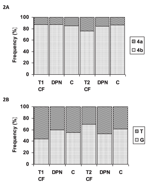 | Figure 2: Allele frequencies of NOS34b/4a (A) and NOS3 rs1799983 (B) in type 1 and type 2 diabetic-associated microvascular complications. In (Figure 2A) the alleles 4a and 4b correspond to the rare and wild type, respectively, and in (Figure 2B), the alleles T and G signify the rare and wild type, respectively. CF, free microvascular complications; DPN, diabetic neuropathy; C, combined diabetic microvascular complications (retinopathy, neuropathy, nephropathy). |