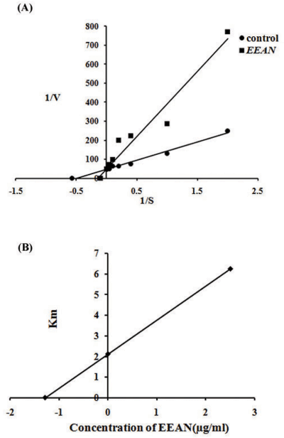| Figure 2: Double-reciprocal plots of the inhibition kinetics of alpha-glucosidase by EEAN. The Lineweaver-Burk plot of alpha-glucosidase inhibition by EEAN (A) and curve for Ki calculation (B). Values are mean ± SE of three independent experiment, each performed in triplicate. |