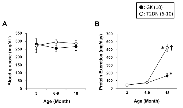 | Figure 1: Time course measurements of blood glucose levels (Panel A) and urinary protein excretion (Panel B) in Goto-Kakizaki (GK) rats and the modified GK substrain susceptible to diabetic nephropathy (T2DN) rats during 3 to 18 months of age. Numbers in parentheses indicate the number of rats studied per group per time period. Values are means ± S.E. |
