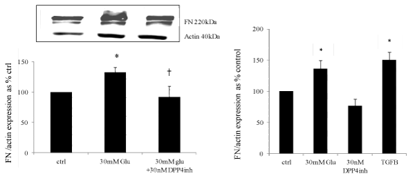 | Figure 2: The effect of DPP4 inhibition on fibronectin expression (a) DPP4 inhibition with linagliptin (30 nM) reduced high glucose induced fibronectin expression HK2 cells were treated with high glucose (30 mM) and linagliptin (30 nM) for 24 h. Cell lysate was collected and fibronectin was quantitated using western blot. N=4, * p<0.05 vs. ctrl, † p<0.05 vs. 30 mM Glu. (b) DPP4 inhibition with linagliptin alone did not affect basal levels of FN. TGFβ 1 is used as a positive control. N=4, *p<0.05 vs. ctrl. |
